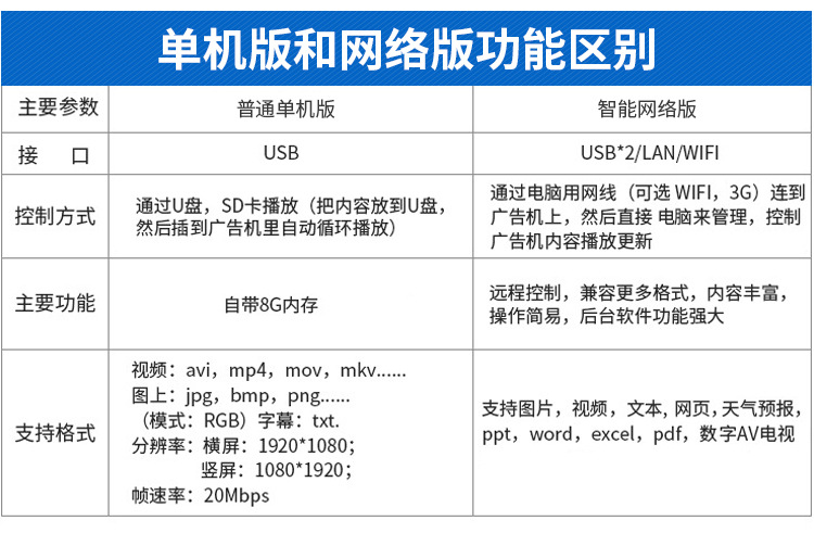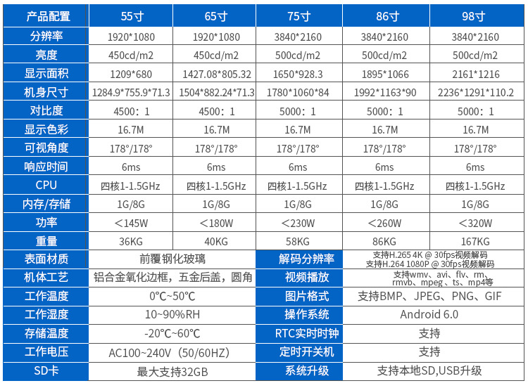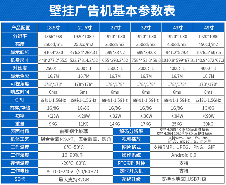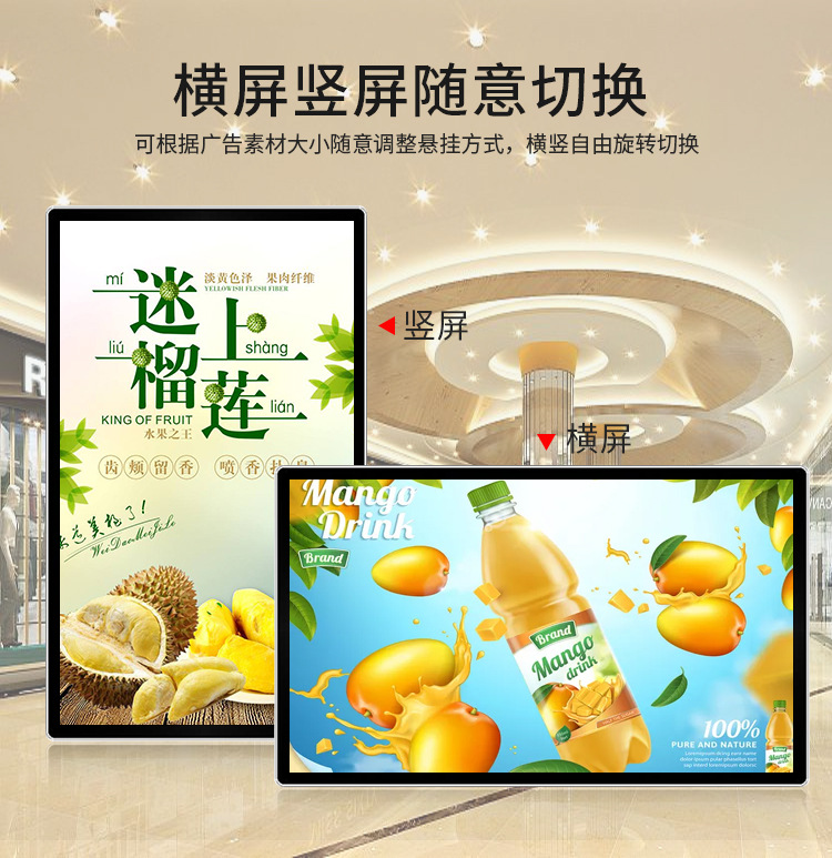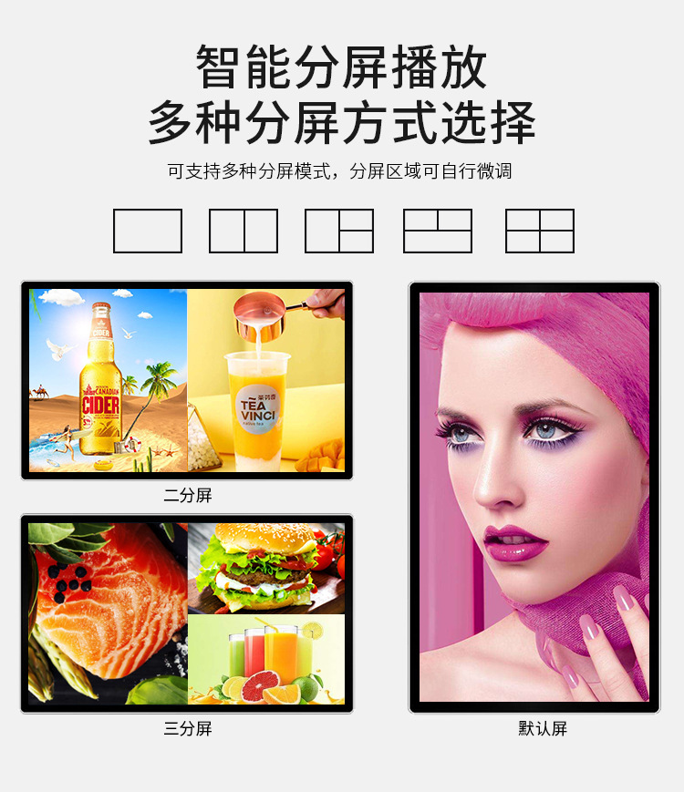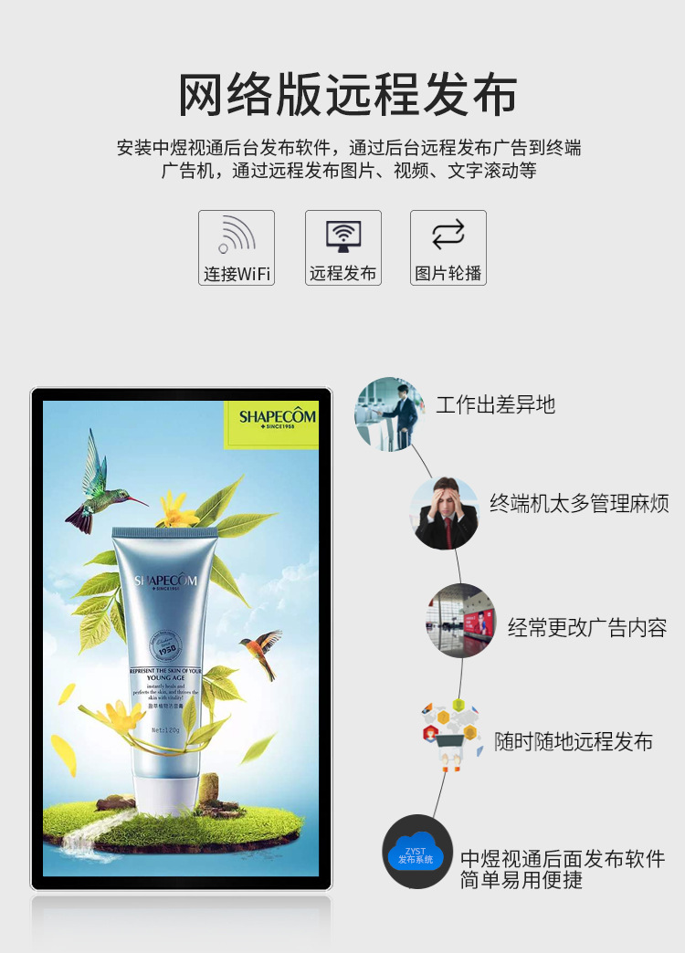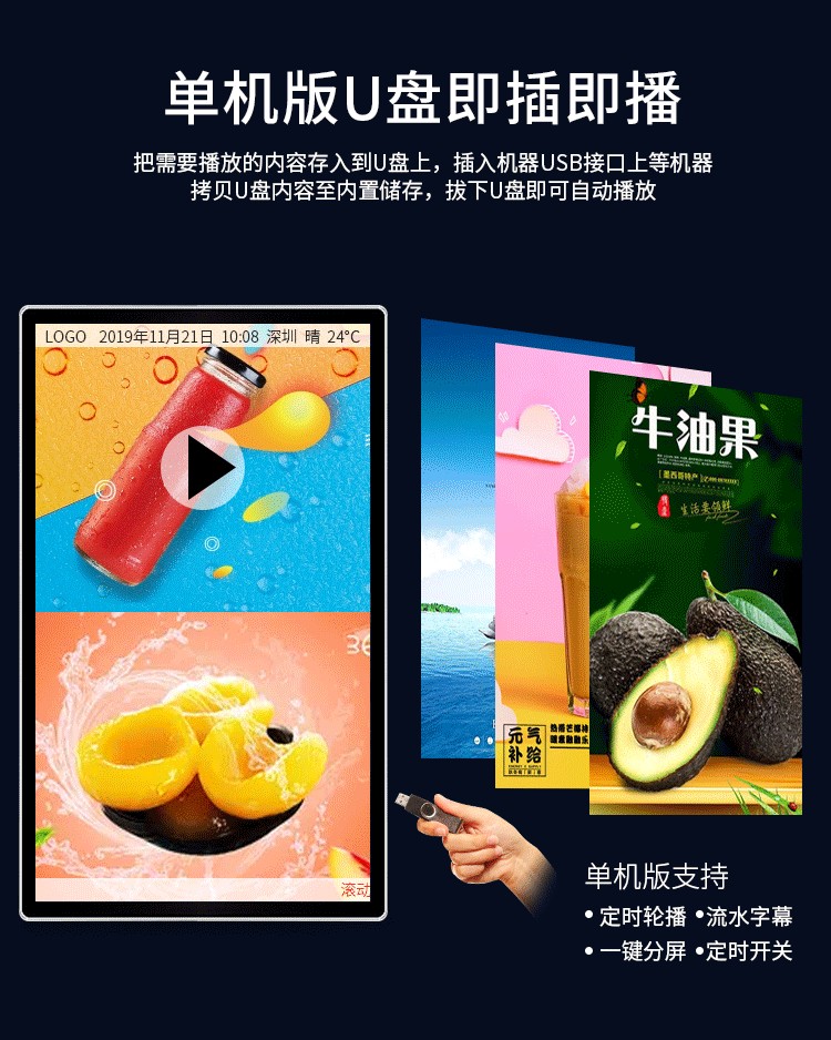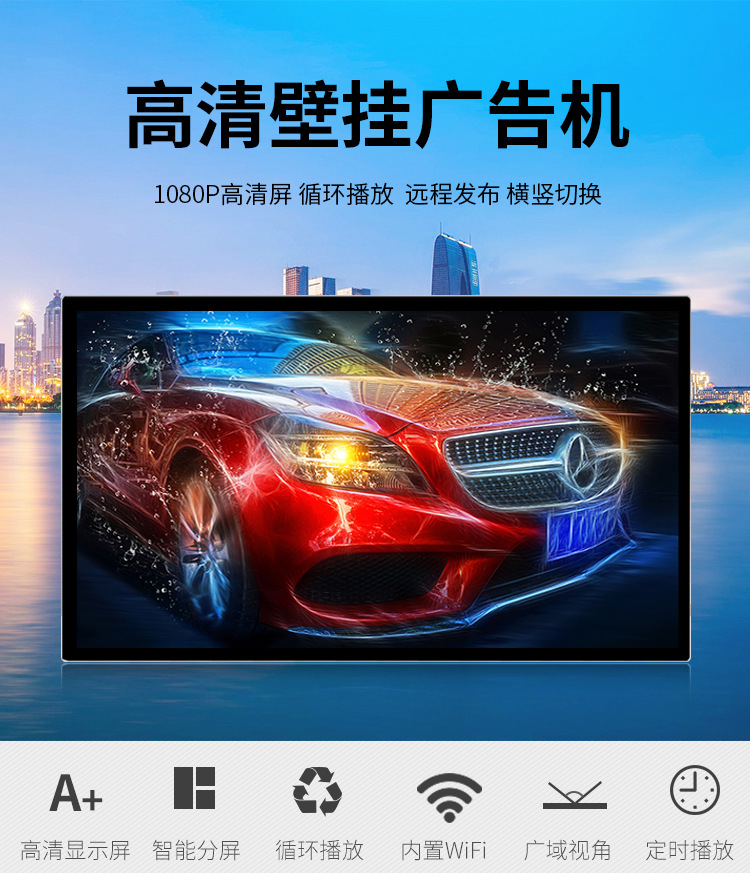 86寸壁掛廣告機采用專業級工業液晶屏,視頻圖像展現清晰、自然,能夠更好的表現廣告細節;機身設計外觀時尚、大方,超薄,使用方便、美觀,采用全新環保技術,穩定性好,能夠適應并在惡劣環境中正常工作。正常使用情況下,可達60000小時以上的超長的使用壽命,并且能夠7*24小時不間斷工作。目前,液晶廣告機憑借優良的顯示性能,已經成為人們認同的理想的“第五大媒體”顯示設備。